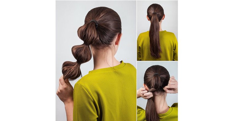 Get the look: Gather your hair in a high ponytail and secure with an elastic. Mist the ponytail with a flexible hair styling spray to control flyaway hairs. Place fine elastics at equal intervals along the length of the tail. The last one should be 2-3 inches from the bottom. Then gently expand the hair between each of the elastics to form rounded shapes.